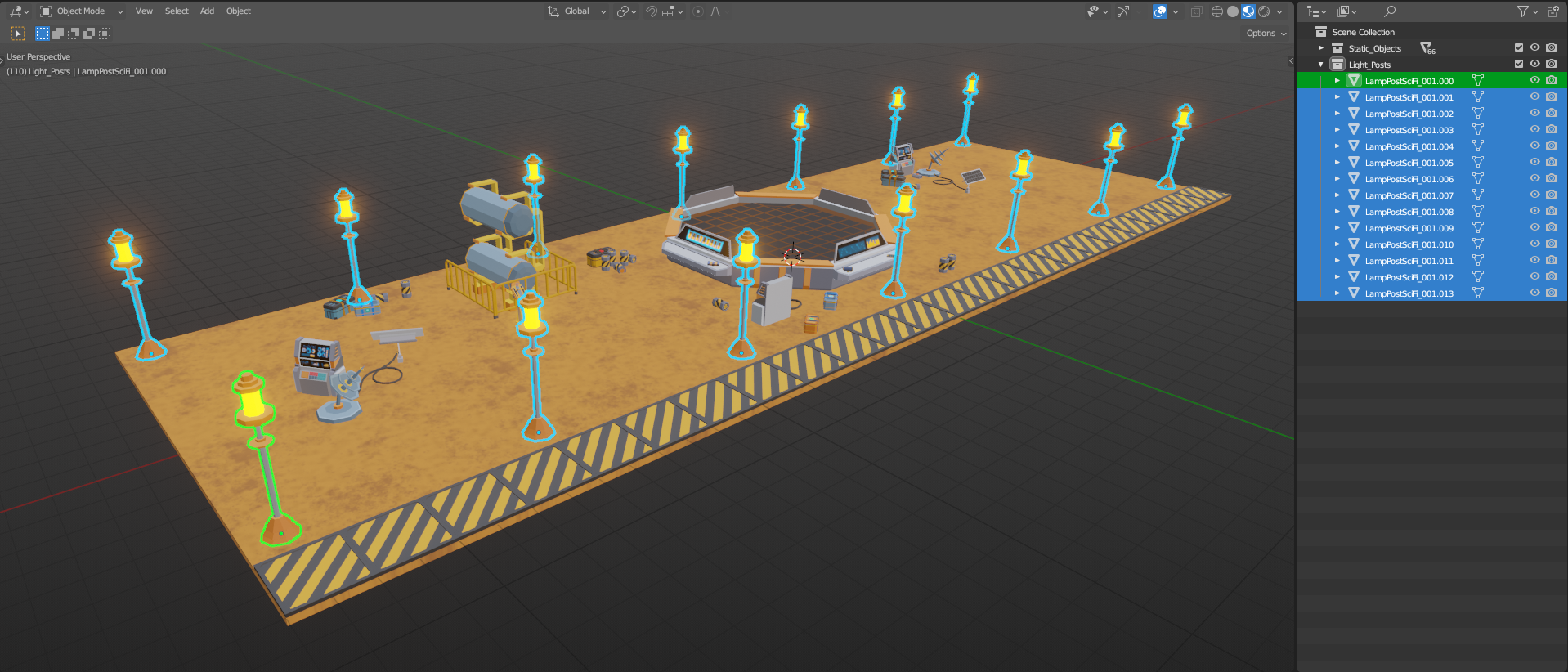 In some cases, when duplicating objects like trees, plants, and light posts, instancing can significantly improve performance compared to duplicating them. For example, this scene has fourteen light posts, all of them are exactly the same. We know that each light post has two different textures, one for the post and another one for the light. So in this case we will have two draw calls, one per texture.