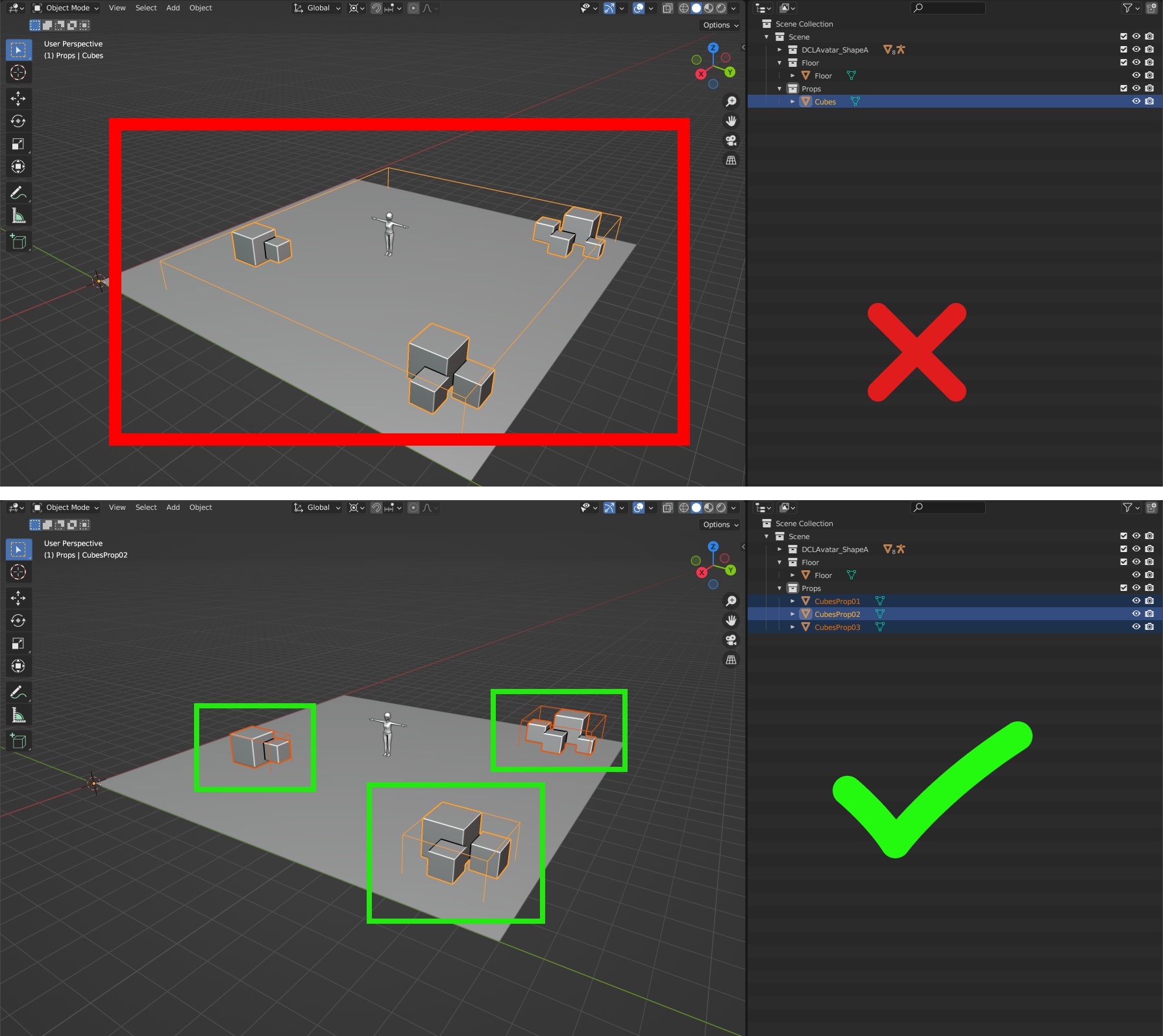 Every mesh has a bounding box, that surrounds the limits of the shape. To make a 3D model more usable inside Decentraland, make sure that its bounding boxes don’t extend beyond the model more than necessary.
