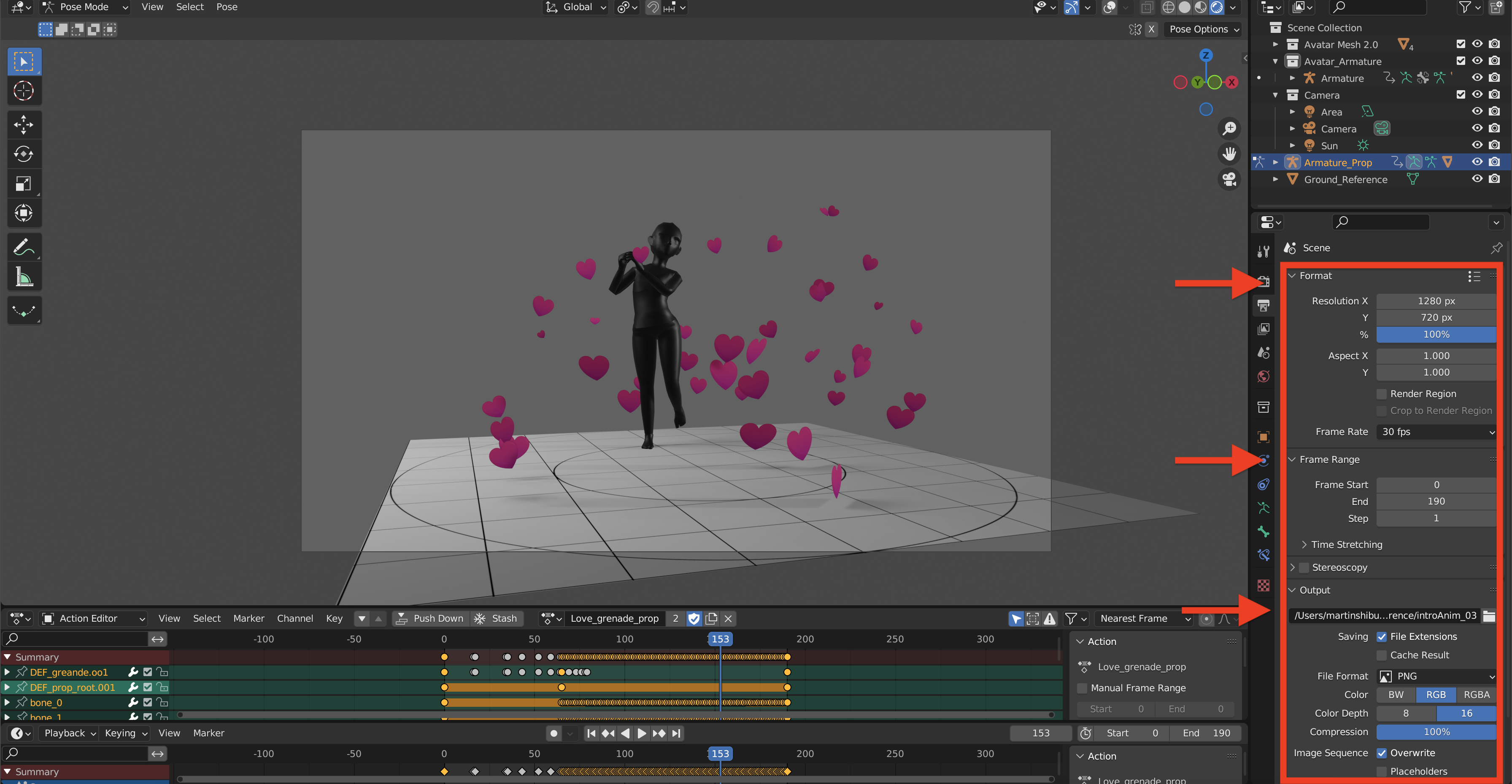 When rendering an emote, it is important to only include the frame range of your emote and not more. Choose an aspect ratio that suits your needs and select the output folder where you want the video or image sequence to be saved.