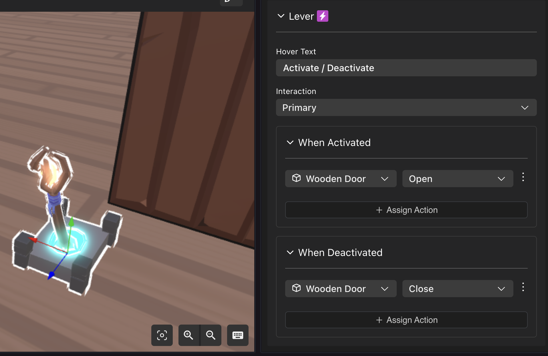 You can also chain actions. For example, if the door that is opened by the lever includes an action in its own When Opened field, this action will also be triggered indirectly by the lever.
