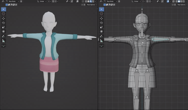 1. But it is also good to keep in mind that you can easily alternate from A-Pose to T-Pose just toggling back the “Edit mode” and “On cage” in the armature modifier.