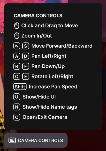 If you’d like to get snapshots of your favorite moments in Decentraland, just press C on your keyboard to open the Camera. A helpful guide with camera controls can be found on the bottom right of your screen.