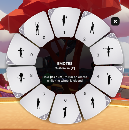 To use Emotes in Decentraland, you’ll want to become familiar with the Emote Wheel pictured below. This shows a set of the 10 Emotes you are most likely to use (you can customize these Emote slots from your Backpack). To trigger an Emote, you have 3 options: