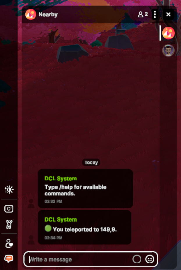 When you’re in-world, you can always see a chat bar in the lower left corner of your screen. This is where you can access chats with your friends, as well as the Nearby Chat. Identifiable by the Decentraland icon, Nearby Chat is where you can chat freely with people around you in-world, even if you aren’t friends. The Nearby Chat can also be used for entering Chat commands that only you will see.